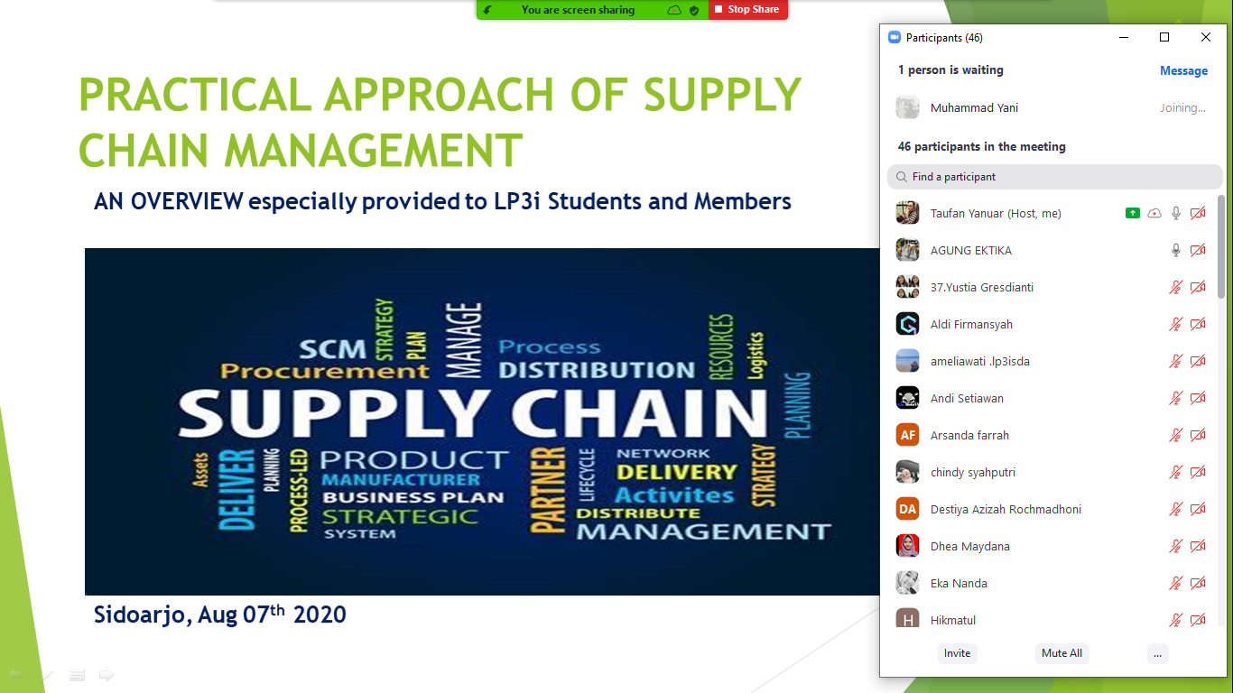 Hari Jumat, tanggal 7 Agustus 2020 ini merupakan hari terakhir Pengajaran Daring atau kuliah online dari IPOMS kepada kelas Logistic Management kampus LP3i Sidoarjo. Materi yang dibawakan oleh Agung Ektika, Supply Chain Manager at PT Cargill Indonesia, adalah Practical Approach of Supply Chain Management sekaligus merangkum dari pengajaran sebelumnya.