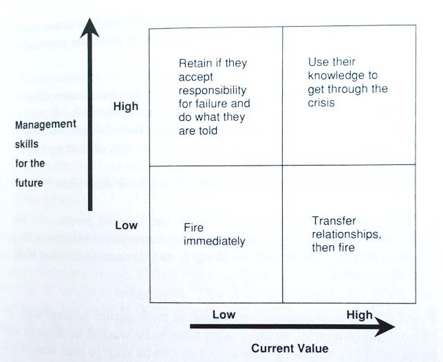 Di bawah ini adalah diagram yang dikenalkan Slatter dan kawan-kawan dalam menentukan seleksi dari manajemen yang ada untuk kemudian bergabung dalam tim manajemen turn-aorund perusahaan, yaitu: